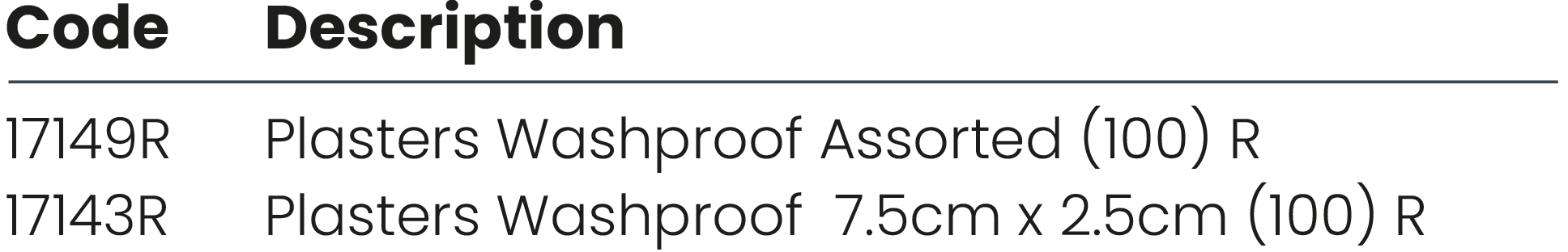 Washproof plasters are a comfortable and convenient way to keep wounds clean, ventilated and protected by providing long lasting, reliable adhesion. With a skin friendly, strong adhesive which provides superior protection against water, germs and dirt. The washproof plaster range is suitable for those who need to protect their wound while showering, bathing, and swimming.